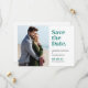 This modern horizontal save the date card features a vertical photo. The "Save the Date" appears in a dark teal classic bold text on a white background. The backside offers custom text for your wedding website.