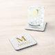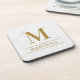 An elegant beverage coaster featuring a warm brass gold serif initial and custom family name monogram with horizontal rules on a white marble stone background. The luminous gold against creamy marble creates a luxurious, elevated accent for entertaining. A beautiful personalized gift for weddings, anniversaries, or housewarmings. All text is fully customizable.