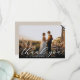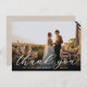 Elegant wedding thank you cards feature a single horizontal or landscape orientated photo with "Thank You" overlaid in chic white calligraphy script, Personalise with your names and wedding date along the bottom in classic block lettering. Add a personal message and signature to the back.