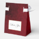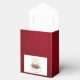 Timeless and elegant yet festive holiday-themed wedding favour box design featuring classic hand-drawn gold floral crest accented by a colourful spray of red and white Christmas flowers and evergreens. This custom formal template includes editable text fields on a blank element with a gold textured border. The outside features an opulent, ruby red velvet texture background.