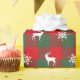 Red and Green Buffalo Plaid with white reindeer and snow crystal silhouettes.
