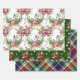 A Classic Group Of Christmas Wrapping Paper Sheets Designed In A Colourful Plaid, Red and White Holiday Flowers And Ornaments In Reds With Bows and Candy Canes