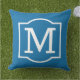 Stylish and classic square outdoor accent pillow features a monogram initial with a simple decorative frame in white colour with cobalt blue background colour. Customise the background to coordinate with your outdoor decor.