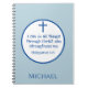 This notebook is perfect to journal in or for notes during Bible Study The notebook has a light blue background with a white circle outlined in blue and inside the Philippians 4:13 scripture verse "I can do all things through Christ who strengthens me." This would make a great gift!