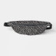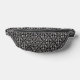 This fanny pack is black and white with a classic damask pattern with curled scrolls.