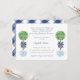 Handpainted topiary ball in a ginger jar planter adorned with a smart blue and white ribbon bow for this classic baby shower invitation design.