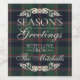 This elegant and contemporary wine bottle label features a plaid pattern with the classic "Season's Greetings" message. It showcases shades of green, dark blue, and red, evoking a classy and nostalgic English holiday ambiance. You can personalize it with your own family name or text. This label is ideal for decorating Christmas gifts in a classic colonial style, as well as for a charming country cottage or log cabin theme.