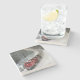 The coasters are gorgeous, a quality feel and heavy weight. They look like a precious archeological find. A rustic stone juxtaposed with a modern floral black and white print. I like the way the print goes slightly imperfect on the cut stone edges giving them a kind-of natural beauty.