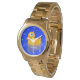 My classic cute yellow rubber duck design on a gold watch with a high bling factor. The blue background colour and the text can be changed to your liking.