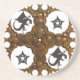 The central section of the coaster is made up of a sculpted, metallic-like formation that resembles hammered bronze or aged metal. It forms a symmetrical cross-shaped pattern with clustered circular nodes, giving the impression of old-world craftsmanship or a piece of Armor. The design evokes the feeling of medieval relics—objects forged by skilled artisans and used for rituals or ceremonial purposes. The surface texture appears dimensional, almost like raised metal, even though it is printed onto the sandstone base. This realistic metallic appearance brings a sense of depth and weight to the artwork.