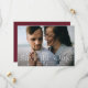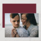 Announce your wedding in style with these elegant photo save the date cards. The design features your full-bleed horizontal photo with "Save the Date" in white lettering. Personalize the modern photo save the date card with your names, wedding date, wedding location, and invitation details. The back of the card features additional details such as your wedding website in white lettering on a solid burgundy/maroon background.