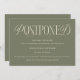 Postponing a big event like your wedding can be stressful, but you can still look stylish with this vintage and minimalistic change of plans template card. It says "Postponed" in stylish typography font at the top with a little heart. The background is sage green.