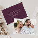 Elegant wedding thank you cards featuring your full-bleed horizontal wedding photo with "Thank You" in plum purple lettering. Personalise the modern photo thank you card with your name. The back of the photo wedding thank you card displays your custom message in white lettering with a solid purple background.