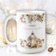 White and cream hot cocoa or chocolate Christmas Large Coffee Mug in classic modern farmhouse style featuring pine, white Christmas flowers, lantern and a cute bird. Easily customise the text - Kate Eden Art