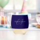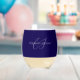 the design shows name monogram with name in white classic calligraphy and typography with blue background.