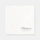 Custom-designed wedding cocktail paper napkins featuring personalized family name and wedding date in classic elegant script.