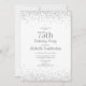 Classic and elegant 75th birthday party invitation in white with silver glitter and a calligraphy font. Contact us for help with customisation or to request matching products.