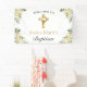 Welcome your guests to your baby's baptism with this beautiful white floral gold cross baby baptism welcome banner. This banner for baptism features a simple white background with white roses and botanical accents in each corner. An elegant gold cross with white roses is featured as the centerpiece. Personalise with your child's name underneath the golden cross. Perfect for either a baby boy baptism or a baby girl baptism.