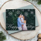 An elegant, classic holiday card design featuring a full bleed horizontal or landscape orientated photo, with a snowflake border at the top. "Happy Holidays" appears in traditional calligraphy script. Personalise with your family name and the year in white lettering at the lower right, and add a second photo to the back.