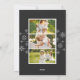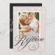 Elegant holiday photo card features a soft cameo blush background dotted with festive white snowflakes, with your favourite vertical or portrait orientated photo framed by a white border. "Rejoice" appears along the bottom in traditional calligraphy script lettering, with your family name tucked into the design, in rich charcoal grey. Personalise the dark grey back with three additional photos and a custom Christmas greeting.