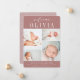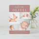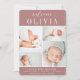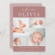 Elegant birth announcements feature four newborn photos arranged in a grid collage layout on a dusty rose pink background. "Welcome [name]" appears at the top in chic calligraphy script and classic block lettering. Personalize with baby's full name, birth stats, and a family signature at the bottom.