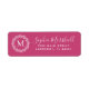 Chic monogram return address labels with easy to personalise templates - A white wreath silhouette surrounding a stylish monogram on a fuchsia pink background. The template for your name is in an elegant calligraphy script and the address is written in a simple font. Personalised return address labels with a feminine wreath and monogram adds a clean and personal touch to your mail. To change the background colour, font styles and sizes click the personalise button.