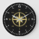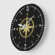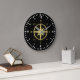 Clock with classic gold compass and white number faceplate on a black background. Customisable. Modern and trendy, yet classic, this clock is perfect for any decor.