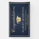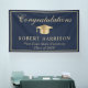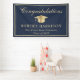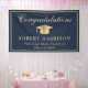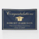 Classic blue graduation party welcome banner featuring a gold grad cap, "Congratulations" in an elegant calligraphy script and the graduate's name, school and class year in simple modern typography.