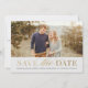 A photo save the date announcement with classic type and calligraphy script in gold faux foil texture (meant to look like foil but it is not actually foil pressed) and landscape photo aperture.