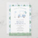 Classic with a twist light blue and sage green golf-themed first birthday par-tee invitation fdesign eatures a hand-painted golf buggy with balloons and a tee flag with space for a number. All watercolor elements were hand painted by me before being scanned into digital form. The reverse of the invitation is a light blue and sage green argyle pattern, created digitally by me.