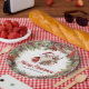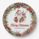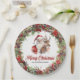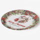 Traditional Christmas plates with timeless watercolor illustration at Santa with reindeer embracing classic Christmas wreath with red holly berries and greenery. Easily personalise the text or leave it blank.
