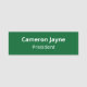 Personalise our professional green name tag with employee name, professional job title, or other custom text. It's available with a magnetic back fastener (do not use with pacemakers) or with a safety pin back. This is a two line green name tag with white lettering and a simple classic design (all colours are customisable). It's 3 inch x 1 inch and available in other shapes. The rectangle name tags are available in other sizes. No minimum order quantity and no setup fee.
