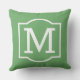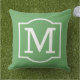 A classic outdoor pillow featuring a bold white monogram initial inside a decorative bracket frame on a rich green background. The oversized serif letter and elegant notched border bring a fresh, preppy accent to patio seating, garden furniture, or porch chairs. The initial is fully customisable.