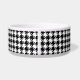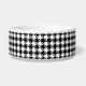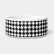 A dog bowl adorned with a classic black and white houndstooth pattern and a stylish black paw print to monogram with your pets initial.