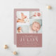 Elegant birth announcements feature four newborn photos arranged in a grid collage layout on a dusty rose mauve background. "Introducing [name]" appears beneath in chic calligraphy script and classic block lettering. Personalise with baby's full name, birth stats, and a family signature at the bottom.