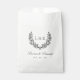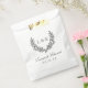 Custom-designed wedding favour bags featuring classic style laurel wreath monogram design with couple's initial, name, and wedding date