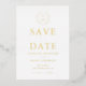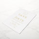 Announce your wedding date to family and friends with this customisable gold foil-pressed save the date announcement card. It features a laurel wreath with classic typography. Personalise by adding your own details. This gold foil save the date card is also available in other foil colours.