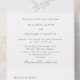 An elegant and traditional all-in-one wedding invitation featuring a shield crest with leaves in light grey with your monogram in the centre. Leaf motifs are scattered across the design, with a handy tear off rsvp section. Personalise with your details in grey text.
