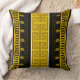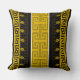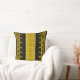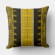 This square throw pillow artwork consists of closely related classic Greek Key meander line shapes on a deep black and warm mustard-yellow canvas background, with a two-fine-white-line vertical overlay that produces a stunning contrast interaction.