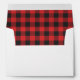 Classic country white holiday envelopes featuring modern placeholder text. The interior of the envelope is decorated with a chequered black and red classic lumberjack pattern.
