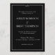 An elegant, classic yet modern and minimalist style, black and white wedding invitation. A white border surrounds the details of the invite, while the couple's initials and an ampersand sits in the center at the top.