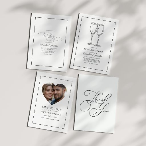 This timeless minimalist black and white wedding invitation features an elegant thin border, sophisticated script, and refined serif typography. A convenient QR code on the back allows guests to easily access the couple’s wedding website for additional details. Perfect for modern, classic, or formal weddings, this design exudes simplicity and elegance. Easily personalise with your wedding details and photo for a beautifully understated and chic announcement.