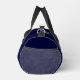 This stylish, modern personalised duffel bag features a classic serif monogram and sans serif name in white on a navy blue background.