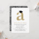 This classic and simple gold and white graduation party invitation card design features a bold monogram letter 'a' of the graduate with a mortar board / graduation cap as an accent.