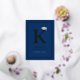 This classic and simple graduation announcement folded card in real foil pressed / foil stamped / foil stamping gold colour and dark navy blue graduation design features a bold monogram / initial 'K' of the graduate's first name with a mortar board / graduation cap.