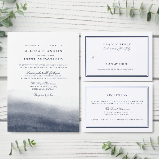 Designed to coordinate with our Navy Tides wedding invitation, this simple and chic wedding response card features a double border of rich nautical navy blue with elegant block and script lettering in matching navy. Cards reverse to soft pale grey and white stripes.