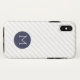 Striped monogram iPhone case. Classic thin white text monogram within a round navy blue border on diagonal thin stripes in navy blue.
