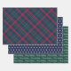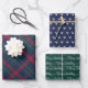 Festive holiday gift wrap set features three coordinating holiday wrapping paper sheets: classic Scottish tartan plaid patter in navy blue, forest green, red, and white, forest green with elegant white script "Merry Christmas" text, and navy blue with white deer head with antlers silhouette pattern.