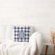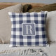 Custom-designed modern rustic throw pillow featuring personalised monogram on navy blue buffalo check pattern.