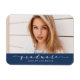 Send your loved ones a photo magnet to celebrate your graduation. The graduation photo magnet features a stylish script font, navy background, and placeholders for an image and custom text.